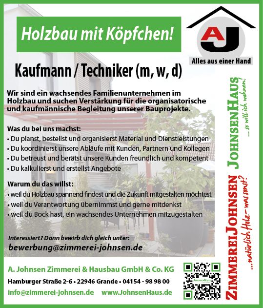 Kaufmann / Techniker (m/w/d) im Familienunternehmen Holzbau Holz im Herzen, Zahlen im Griff Wir wachsen kontinuierlich und suchen zur Verstärkung unseres Teams einen engagierten Kaufmann bzw. Techniker (m/w/d), der unsere Bauvorhaben organisatorisch und kaufmännisch begleitet. Was Du bei uns machst : Du jonglierst Termine unserer Bauvorhaben ohne das etwas herunterfällt Du planst, bestellst und organisierst Material und Dienstleistungen – rechtzeitig und logisch Du rechnest Angebote, die Sinn machen (für den Kunden und fürs Unternehmen) Du betreust und berätst unsere Kunden am Telefon – freundlich, kompetent und ohne Fachchinesisch Warum Du das willst: Weil Du Holzbau spannend findest und die Zukunft mitgestalten möchtest Weil Du Verantwortung übernimmst und gerne mitdenkst Weil Du Bock hast, ein wachsendes Unternehmen aktiv mitzugestalten Was wir Dir bieten: Unbefristeter Job Voll- oder Teilzeit – so, wie es zu Deinem Leben passt Flexible Arbeitszeiten statt Stechuhr-Feeling 30 Tage Urlaub zum Abschalten, Auftanken und Wegfahren Ergonomischer Arbeitsplatz (Dein Rücken wird es lieben) Abwechslungsreiche Arbeiten statt Einheitsbrei Top Fort- und Weiterbildungsmöglichkeiten, weil Stillstand nichts für uns ist Kurz gesagt: